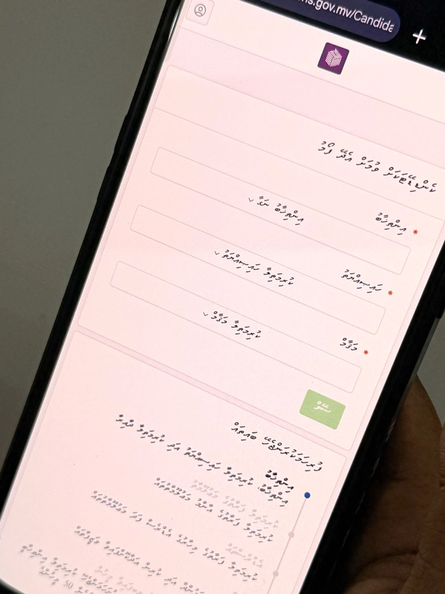 އިންތިޚާބަށް ކުރިމަތިލުމަށް އެދޭ ފަރާތްތަކުން ފޯމު ހުށަހަޅާނީ، އެ ފަރާތެއްގެ އަމިއްލަ ވެރިފައިޑް އީފާސް އެކައުންޓް މެދުވެރިކޮށް މައި ޕޯޓަލް my.elections.gov.mv އަށެވެ. އަދި ފޯމު އޮންލައިންކޮށް ހުށަހެޅޭނީ، ހުކުރު ދުވަސް ފިޔަވައި ކޮންމެ ދުވަހަކު ހެނދުނު 8:30 ން މެންދުރުފަހު 15:30 އަށެވެ. އަދި ހުކުރު ދުވަހު މެންދުރުފަހު 15:30 އިން ހަވީރު 18:00 އަށެވެ.